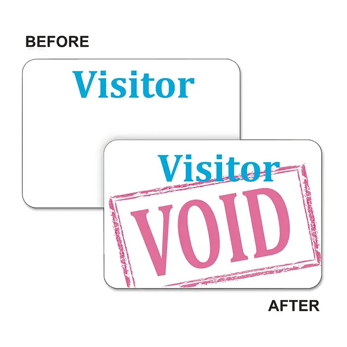 These easy-to-use, self-expiring badges are ideal for visitor control. Highly visible, color spot indicator signifies badge expiration. They help identify trespassers up to 50' away. Time's Up! One-Day Spot Badges reveal a bright red VOID notice after one day. To activate these self-adhesive badges, simply adhere the two parts together.