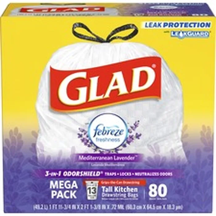 Fight nasty kitchen odors with Glad Tall Kitchen Drawstring Trash Bags and the steady release of Febreze freshness. ForceFlex technology provides extra flex as it expands around sharp edges and heavy loads to let you pack it in while resisting tears, rips and punctures. A steady release of the Mediterranean Lavender scent keeps your kitchen pleasantly smelling great with long-lasting odor control. With double-sided seals and a reinforced bottom, these bags are designed with RipGuard and LeakGuard technology to prevent seepage of liquids and keep trash contained. The durable, Grips-The-Can Drawstring ensures a tight grip on the trash can to keep it in place. Trash bags are perfect for use in offices, schools, daycare centers, restaurants, hotels and more.