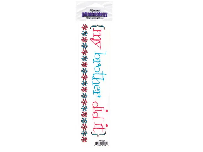 Perfect for scrapbooking, card making or any craft, this fun 8" x 2" My Brother Did It Creative Rub-On Transfer features a children's font and a flower border. Includes one sheet of transfers and an applicator stick. Transfers can be used on paper, wood, fabric and other surfaces. Comes packaged in a poly bag with a header card. Package measures approximately 9.25" x 2.25".