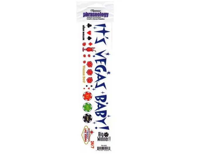 Elevate your scrapbooking and card making with our Vegas Baby! Creative Rub-On Transfer. This unique 8" x 2" transfer sheet showcases vibrant Las Vegas-inspired phrases in various eye-catching fonts along with fun casino graphics.