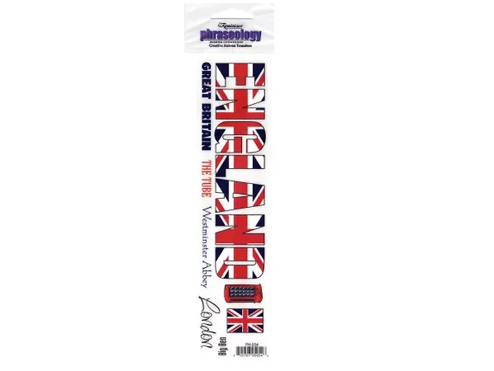 Add a touch of England to your craft projects with this British flag-themed rub-on transfer. Size 8 inches by 2 inches, it features the word 'England' in a striking font adorned with the British flag, along with various England-related terms in different styles. This versatile transfer set includes a British flag and an iconic phone booth, making it perfect for scrapbooking, card making, and other creative endeavors.