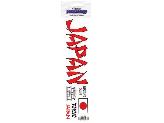 Enhance your crafting projects with the Samurai Themed Japan Creative Rub-On Transfer. This versatile transfer sheet measures 8" x 2" and showcases the word 'Japan' in a striking Samurai font, along with smaller Japan-related terms presented in various styles. It also features iconic images such as the Japanese flag and traditional houses.