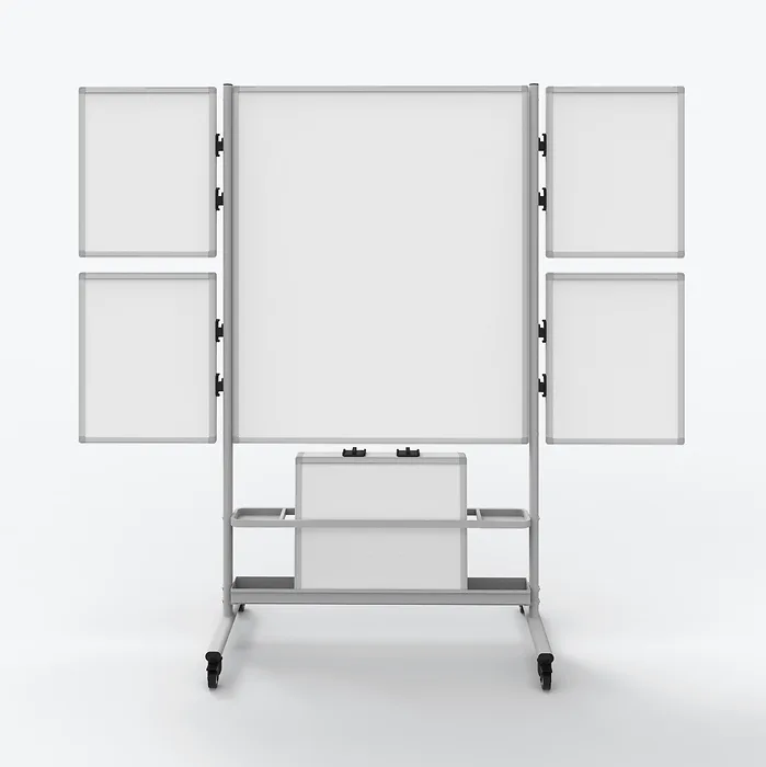 Transform your business or classroom into an interactive workspace with the Luxor Collaboration Station, a double-sided mobile magnetic whiteboard with four attachable marker boards. Designed to create a productive work environment where teammates can interact and share ideas, this mobile whiteboard’s surface area is easily extended by attaching four small whiteboards to connectors on the sturdy steel frame. The double-sided small boards can be used individually and when not in use, are conveniently stored in the built-in storage tray. Whether visualizing ideas on the large whiteboard or with all five boards joined together, or using individual boards for group interaction, the Collaboration Station is the perfect tool to inspire innovation and creativity.FEATURES:Large magnetic whiteboard with four attachable small whiteboardsABS plastic connector clips allow smaller whiteboards to easily attach and remain secureTwo-sided whiteboards double the writing surfacePainted steel surface resists ghosting and provides excellent erasabilityMagnetic whiteboard surface allows for hanging of documents and morePowder-coated steel frame provides strength and durabilityFour 2.5" casters, two with locking brake, provide easy mobilityDual-purpose marker tray supports four small dry erase boards and holds markers and erasersAdditional 4-packs of small whiteboards availableAssembly requiredDIMENSIONS:Overall: 82.25"W x 23.7"D x 76.4"HLarge Board: 40.4"W x 48.6"HSmall Boards: 18.75"W x 23.3"H