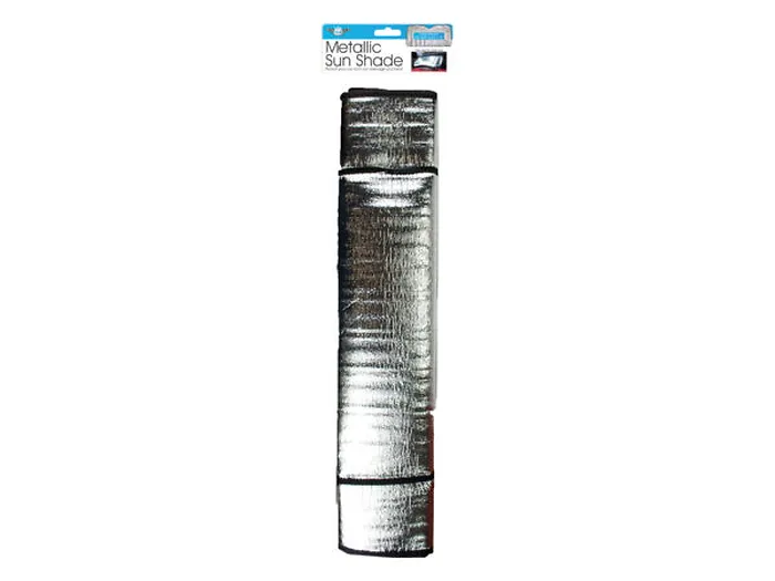 Protect your car from sun damage and heat with this Metallic Auto Sun Shade that preserves vehicle's interior, prevents cracking to dashboard and keeps car cool during the summer. Durable design features a silver foil front, white foam on the back and black nylon edging with two black elastic straps to keep sun shade closed and secure. Folds easily for compact storage. Measures approximately 46 3/4" x 23 1/2". Comes packaged in a poly bag with a header card.
