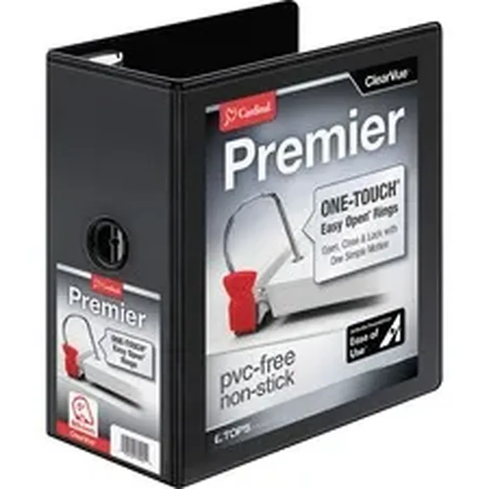 Locking rings of the EasyOpen ClearVue Slant-D Ring Binder open and close with one touch. Locking mechanism engages instantly when closed, eliminating two-handed, two-step operation. Delayed tension means closing rings will not clamp down and pinch fingers if they get in the way. Binder received the Ease-of-Use Commendation from the Arthritis Foundation. EasyOpen Slant-D rings hold 25 percent more sheets than standard round-ring binders. Back-mounted steel rings reduce wear and let pages lie flat. 5" capacity holds approximately 925 sheets. Horizontal inside pockets offer storage for loose documents, and each pocket holds 40 sheets. Clear, nonglare overlays on front, back and spine hold custom title sheets. Design also includes exposed rivets and a sturdy chipboard core.