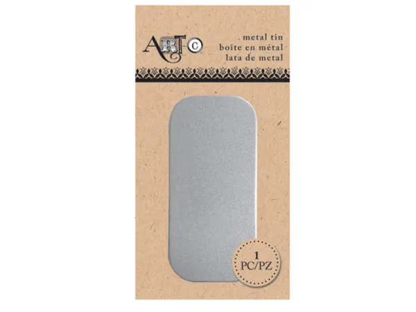 Measuring approximately 2.375" x 0.5" x 1.875", this versatile tin can be used for organizing small items or as a decorative piece. It comes packaged with a hanging panel in a convenient poly bag for easy display.