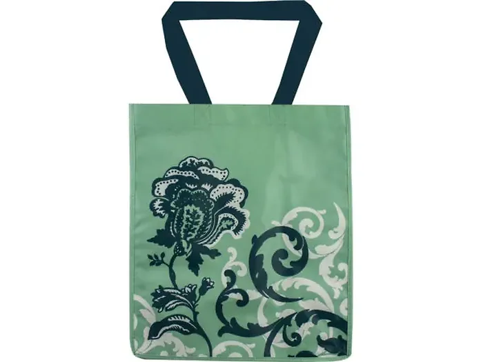 The mint green body adorned with a charming white and dark green floral graphic adds a pop of style to your errands. The bag measures 14" x 8" x 16" and features convenient 10" handles, making it easy to carry.