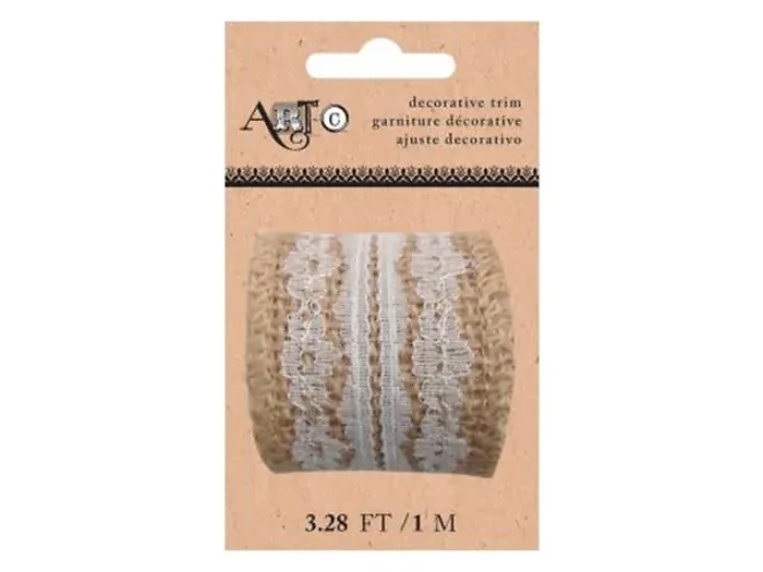 Add a touch of elegance to your crafting projects with this Art-C Burlap Lace Trim. Perfect for scrapbooking, card making, or gift wrapping, this versatile embellishment can be adhered to various surfaces including paper, canvas, denim, and wood. The trim features a charming burlap texture with a delicate white lace center. With approximately 3.28 feet (1 meter) of ribbon, you'll have plenty to create beautiful designs. It comes conveniently packaged rolled on a hanging card for easy storage.