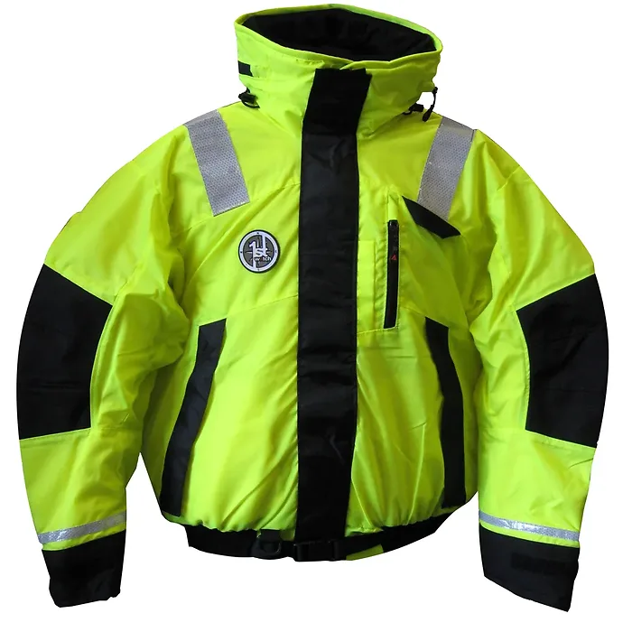 Most safety gear comes with compromises. Most are bulky, cumbersome and look awkward and clumsy to wear. Not the AB-1100 Flotation Bomber Jacket! Looking sleek and modern with all weather features of First Watchs Anti Exposure Suit, this great looking coat fits and moves like no other flotation jacket. Like the traditional bomber style jacket it was designed after, the waist-high cut of the coat allows a free range of movement without excess bulk in the mid-section while angle cut hand warmer slash pockets keep valuables and essential gear close at hand. MMS Fit system will make you forget youre wearing a jacket safe enough to save your life.