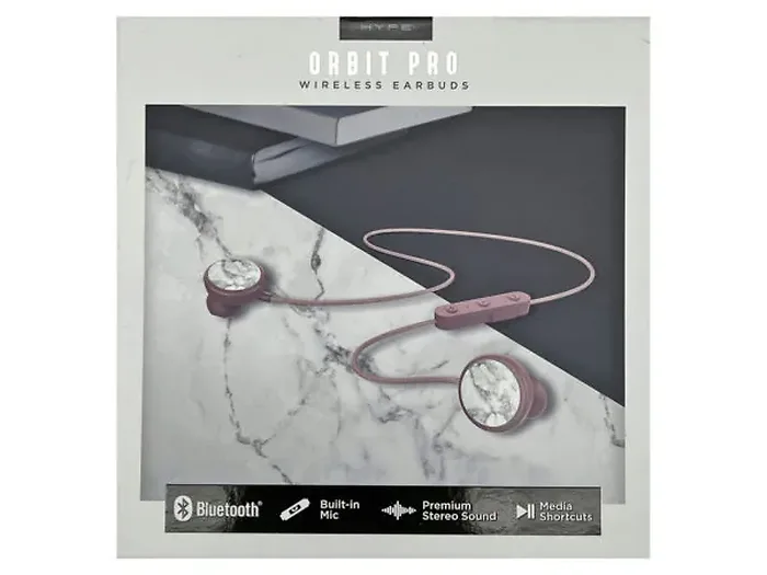 Equipped with a built-in microphone, you’ll never miss an important call while enjoying your music. The chic pink wires contrast beautifully with the black/grey marble earbuds, making them a stylish accessory as well. With a quick charge, the earbuds offer up to 3 hours of connectivity and are compatible with a variety of Bluetooth devices including smartphones and tablets. Includes a charging USB cable and packaged in a high-quality window box for a premium look.