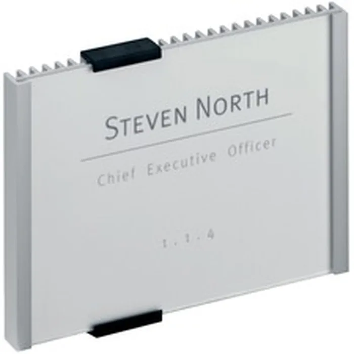 Information sign features a removable top clip for instant updates whenever changes occur. Clear acrylic panel completely showcases your insert for excellent visibility. Aluminum back plate is pre-drilled for easy wall mounting with the included screws and anchors. Plus, adhesive disks provide another way to mount the sign. The elegant back ribs form an attractive design that complements all decors. Use the free, online insert-formatting software to make professional style signs. Sign is compatible with Durable, printable replacement insert packs (sold separately).