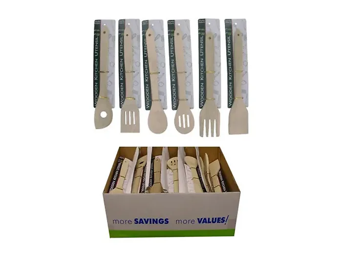 This assortment includes six different wooden kitchen utensils displayed in a convenient cardboard box. Made from durable natural hardwood, these utensils are perfect for use on non-stick surfaces. The set features: