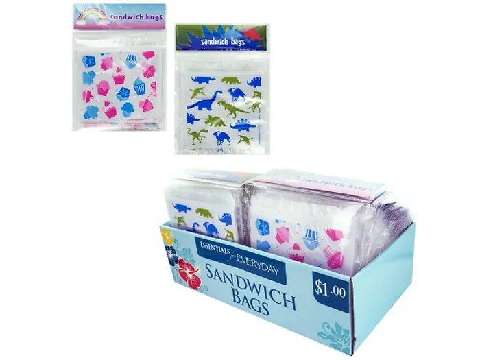 Brighten your child's lunchtime with our colorful sandwich bags! Each pack features 15 unique sandwich bags adorned with fun designs, including cupcakes and dinosaurs. Perfect for school lunches or picnics, these bags bring joy to mealtime. Each countertop display contains 48 packages, making it easy to keep your shelves stocked and your little ones smiling.