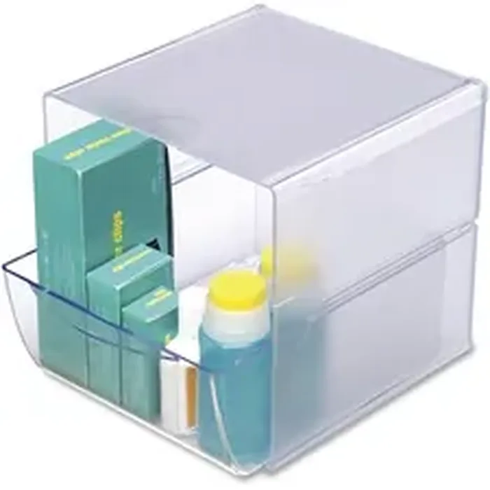Stackable plastic desktop cube organizer holds small supplies to keep your desk clutter-free. Included clips link cube together with other cubes for a custom system. Keep everything in reach and save space with the stacking design. The single drawer is removable.