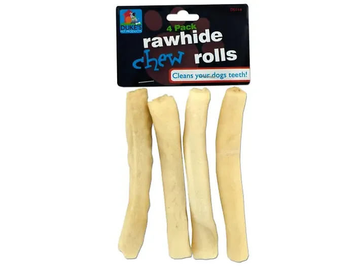 Give your furry friend a treat they will love with our Natural Rawhide Roll Chews! This pack of 4 rolled chews is designed to keep your dog's teeth and gums healthy while they enjoy a tasty snack. Each roll is approximately 5 1/2" long and comes conveniently packaged in a vinyl bag with a header card, making it perfect for storage or gifting.