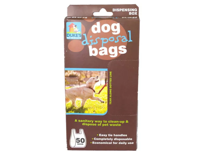 Great for those who love their pets but not the mess they leave behind, this 50-piece Pet Waste Disposal Bags Set provides a sanitary way to clean up and dispose of pet waste. Bags have easy tie handles for fast and secure disposal. Bags comes in an easy dispensing box. Keep away from babies and small children. Each bag is approximately 13" long with handles and 7" wide. Comes packaged in a hanging box. Box measures approximately 4.5" x 1" x 9".