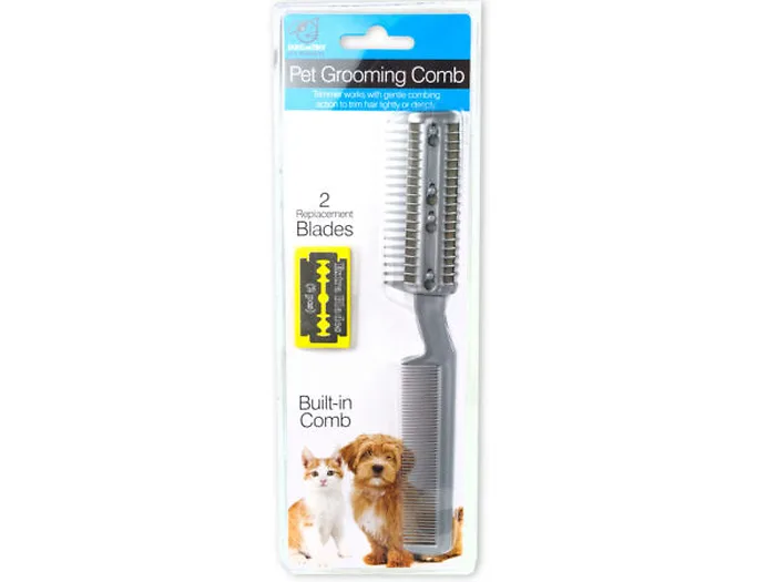 Designed for thinning hair, removing mats and general trimming, this Pet Grooming Comb is the perfect grooming tool. Comb is double-sided: one side has a razor comb for trimming hair while the other side has a standard comb for removing excess fur. Set comes with a 2 extra razor blades. Comb measures approximately 8" long. Comes packaged in a clam shell.