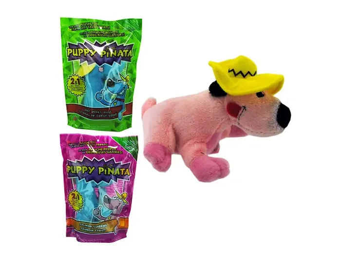The Treat-Filled Plush Puppy Piñata is the perfect blend of fun and flavor for your furry friend. This adorable plush toy features a charming dog wearing a colorful hat, concealing delightful treats inside. Each piñata is packed with irresistible flavors like "Beef Jerky Bliss", ensuring playtime is also a treat time. Ideal for small dogs, this toy comes in a convenient hanging poly bag for easy display.