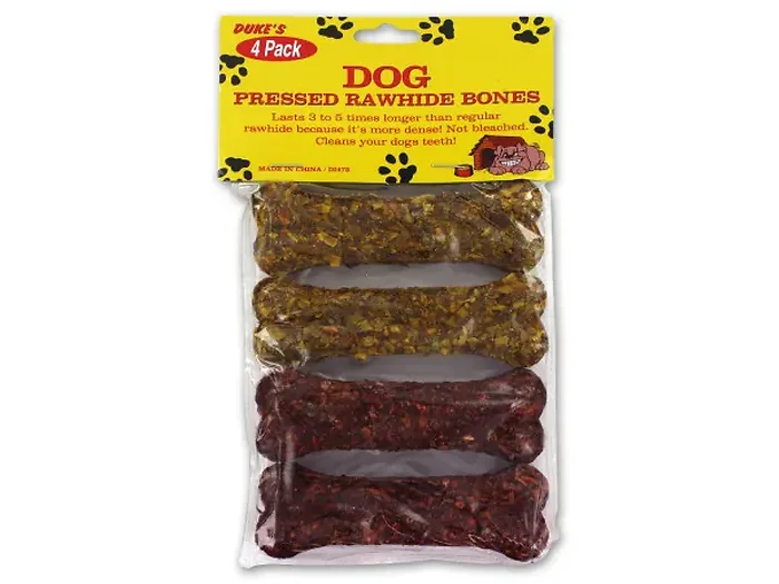 Our durable pressed rawhide chew bones are designed to last three to five times longer than regular rawhide due to their superior density. These bones contain no bleach and are an excellent choice for helping to clean your dog's teeth while they chew.