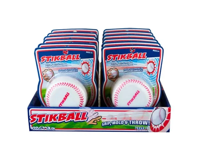 The Hog Wild Stikball Sticky Throw Toy is designed for ultimate fun! This innovative ball grips, molds, and can be thrown at walls or flat surfaces. With its unique sticky surfaces and flexible center, it splats and sticks easily to any flat area, including walls and doors.