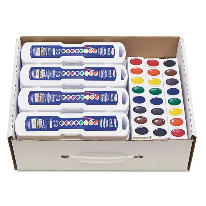 Oval watercolor master pack includes 24 sets of Oval Semi-Moist Cake Watercolors, each with its own white mixing area, and wood-handled natural hair paintbrush plus 12 snap-in color refill trays. Semi-moist watercolor formula is preferred by schools and teachers across the nation. Convenient carrying handle makes storage a snap. Certified AP nontoxic.