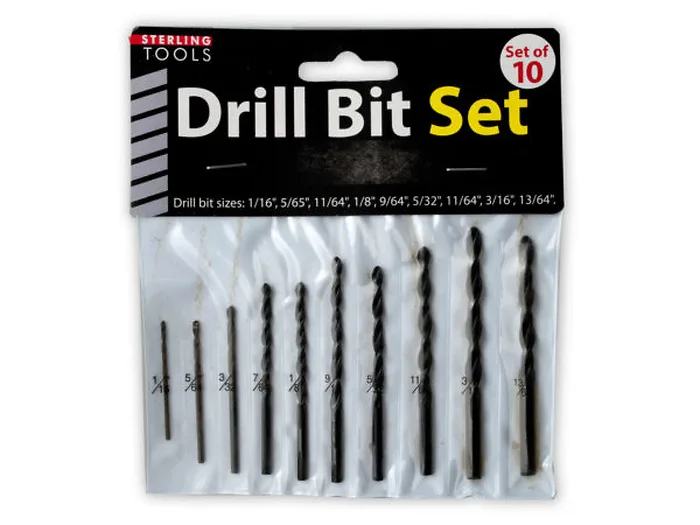Drill bits are a toolbox necessity. Each pack comes with 10 drill bits in the following sizes: 1/16", 5/65", 11/64", 1/8", 9/64", 5/32", 11/64", 3/16", 13/64". Bits are packaged in a PVC bag with header card.