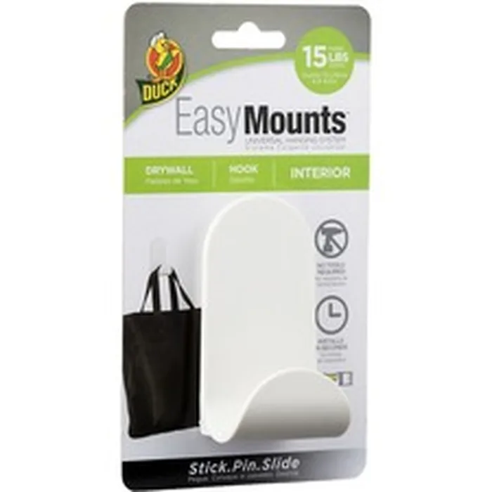 Great for organizing, EasyMounts Interior Drywall J Hook conquers even heavy hanging needs. Sports equipment, step stools and overstuffed backpacks are no match for this innovative mounting system. Each J hook securely holds up to 15 lb. and installs in drywall within seconds so you can quickly relax and enjoy the display. Simply stick, pin and slide. Built-in bubble level helps ensure you're hanging the product perfectly straight. Soft, modern matte finish resists fingers prints and scratches. Universal hanging system allows you to easily switch to another EasyMounts Interior solution in seconds without moving the base. The entire system is completely removable, and only three pinholes remain (much less damage than wall anchors or adhesive hanger mishaps).