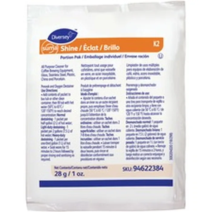 Suma Shine Portion Pak is an oxygen-based, powdered presoak and de-stainer for plastic cups, plates, flatware, utensils, glass coffee pots, coffee urns and tea urns. This alkaline detergent is specially formulated for removal of coffee, tea, cocoa and milk stains. It is effective in removing coffee and tea stains because of active oxygen and removing cocoa and milk stains by alkali source. Suma Shine prevents scaling in hard water conditions when used as directed. This white powder has no fragrance added.