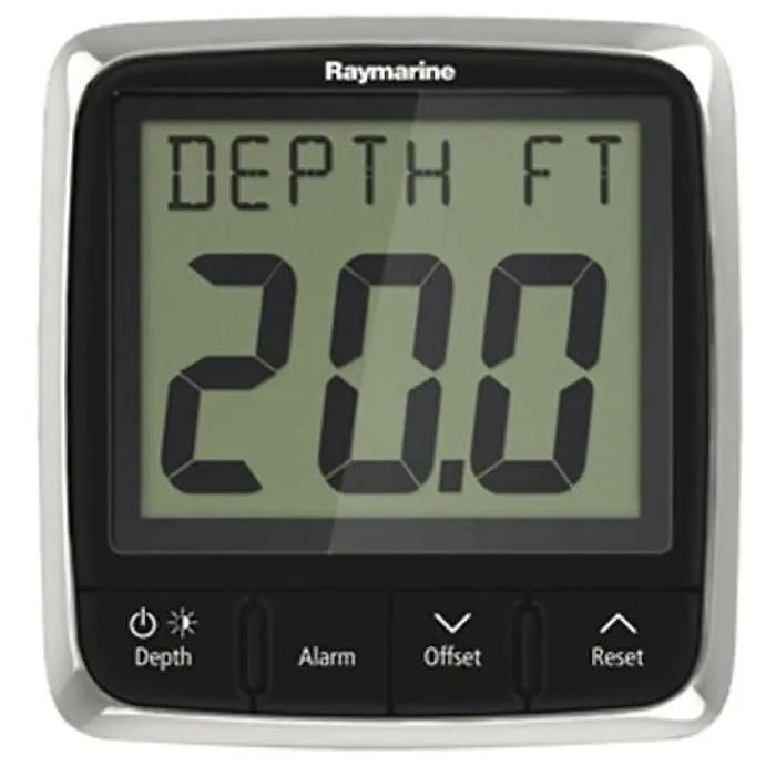 The i50 Depth instrument display reveals real-time water depth along with audible and visible alerts for shallow water. It also tracks maximum and minimum depth as well as the depth trend. With large digits and audible alarms for deep, anchor, and shallow water, this display works perfectly for sail boats, power boats, yachts, and RIBs. The i50 Depth instrument is engineered for easy viewing. Its high-contrast LCD, oversized digits, and red backlighting combine to deliver superior visibility under all conditions. i50 instruments also support local and group dimming control. This makes it easy to adjust the brightness of multiple Raymarine products all at once. Simple push button controls provide easy access to all its data displays. I50 series instruments are the perfect combination of powerful performance, easy operation and rugged reliability.