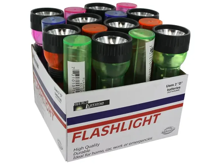 This vibrant and durable LED flashlight set is perfect for home, car, work, or emergency situations. Available in four translucent colors: magenta, blue, orange, and green, these flashlights provide reliable illumination. Each flashlight requires 2 'D' batteries (not included) and measures 7 1/4" long. The set is conveniently packaged in a compact counter display with 16 flashlights in total (4 of each color).