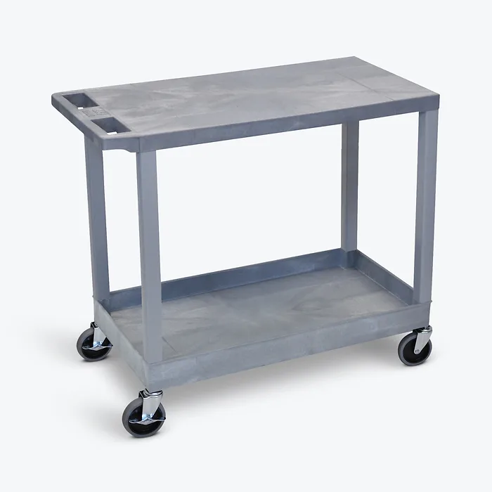 Look to this Luxor utility cart for heavy-duty versatility. Capable of holding and hauling up to 500 lbs., it boasts a dual-shelf design with one 2.5"-deep tub shelf on the top and one thick flat shelf on the bottom. Both shelves are made from rugged thermoplastic resin that won't scratch, dent, stain or rust. And 5" rolling casters – two fixed casters and two full-swivel casters with locking brakes make this heavy-duty cart easy to move when transporting heavy loads.