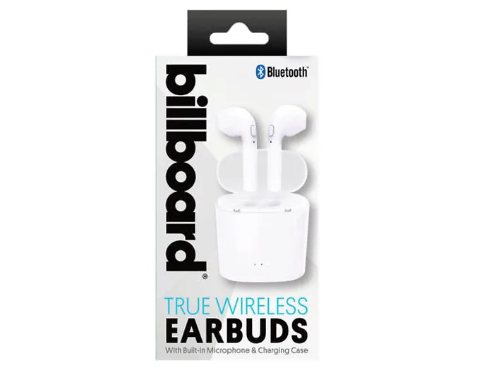 These Billboard Bluetooth Wireless Earbuds are a true wireless solution - no more cords or wires! Each earbud quickly and easily syncs to your smartphone or tablet. Once charged, earbuds can provide up to 10 hours of talk or music time. Wirelessly stream your music via Bluetooth technology up to 33 feet. Enjoy clear, balanced sound with enhanced bass. Control playback and answer calls directly from the earbuds. These wireless earbuds are ergonomically designed to fit comfortably into ears. Conveniently charge your buds at home or on the go using the built-battery located inside the case. Each pack comes with 1 pair of wireless earbuds, 1 case with built-in battery and USB cable. Comes packaged inside a hanging box measuring approximately 3" x 1.5" x 5.5".