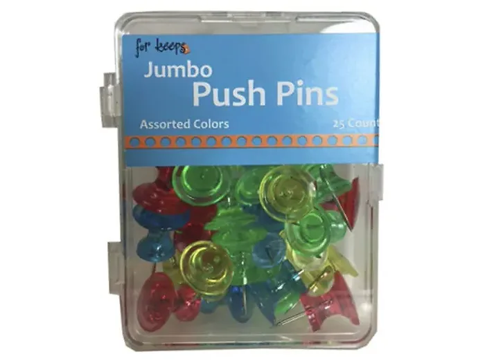 Use these Colorful Jumbo Push Pins to post notes, postcards, reminders, and more! Perfect for both home and office use, their large size makes them easy to push and pull. The set includes 25 push pins in a variety of vibrant colors, all packaged in a convenient snap-close plastic holder measuring 2.45" x 1.15" x 3.5". The box also features a handy hanging hole for easy display.