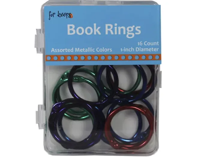 This set includes 16 durable 1" book rings, available in beautiful metallic shades of purple, red, blue, and green. Each pack is conveniently packaged in a reusable snap-close plastic box, measuring 2.5" x .75" x 3.75", making it easy to store and access your rings at any time.