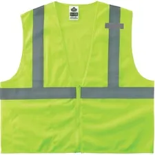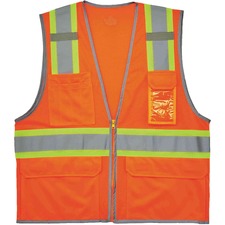 Class 2 Economy Two-tone Vest combines protection, job-specific performance, innovation and style. Design includes ANSI-compliant polyester mesh in an eye-catching fluorescent color and 2" Level 2 ANSI-compliant reflective material set on 4-1/2" contrasting-color background. As light diminishes, background material plays less and less of a role in maintaining conspicuity. That's when retroreflective technologies are so important to make sure workers are seen. The machine-washable mesh fabric is lightweight, weighing only 3.3 oz. Securely close with the zipper. Single inside pocket offers storage for essentials. GloWear 8229Z vest is great for road construction, utility crews, survey crews, construction, railway workers, baggage handlers, emergency response and warehousing/distribution. Large/Extra-Large size fits chests from 44" to 52".