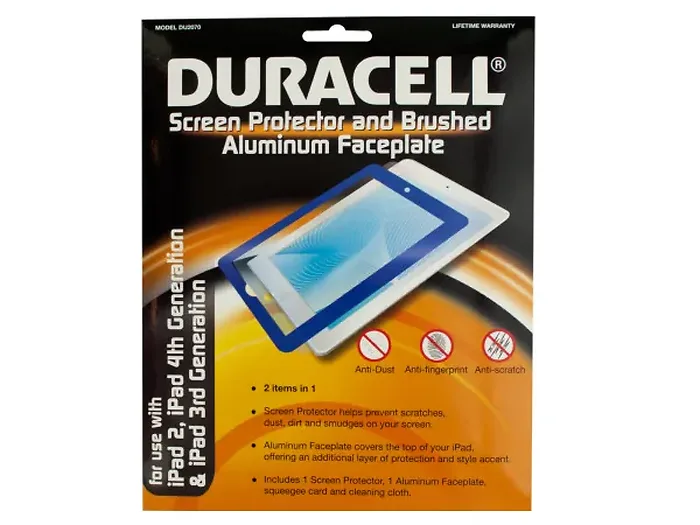 Protect your iPad's touch screen with this premium Duracell Screen Protector and Blue Brushed Aluminum Faceplate. Designed for iPad 2, iPad 3rd Generation, and iPad 4th Generation, this bundle provides essential protection while maintaining a sleek look.