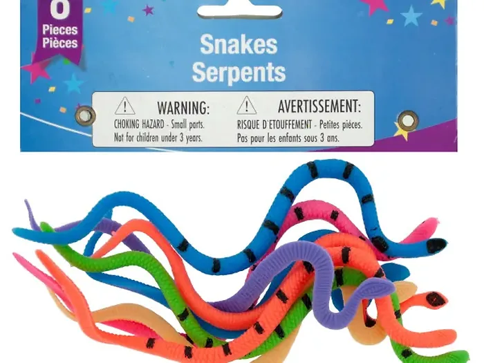 Each snake measures approximately 4" to 6" long and features textured, realistic detailing with assorted colors and black stripe accents. These fun party favors are suitable for ages 3 and up and come conveniently packaged in a poly bag with a colorful header card.