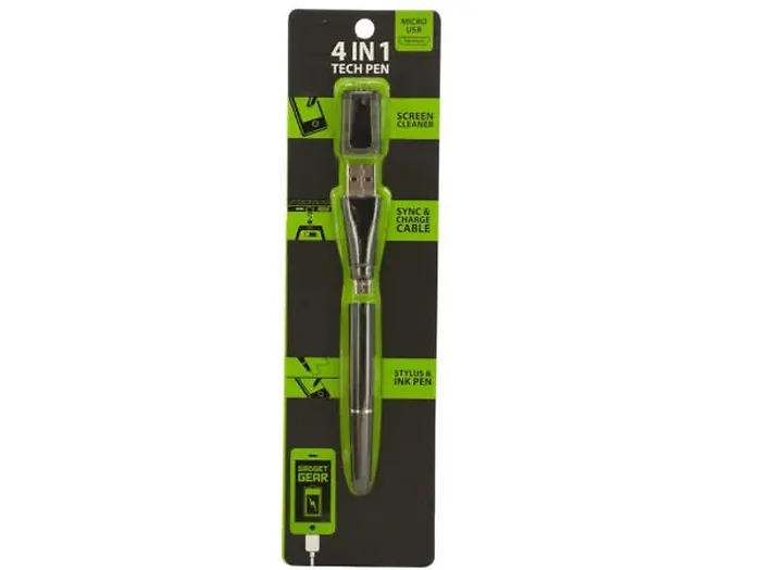 The 4-in-1 Micro USB Tech Pen is the ultimate phone accessory, combining multiple functionalities in a sleek pen design. This versatile pen features a stylus for touchscreen devices and an ink pen; simply rotate the tip to switch between them. It also includes a quick-access Micro USB sync and charging cable, making it convenient for on-the-go charging. The pen comes with a built-in screen cleaner cap to keep your devices smudge-free. Available in a variety of attractive colors and packaged in a blister pack, this tech pen is perfect for anyone looking to combine utility with style.