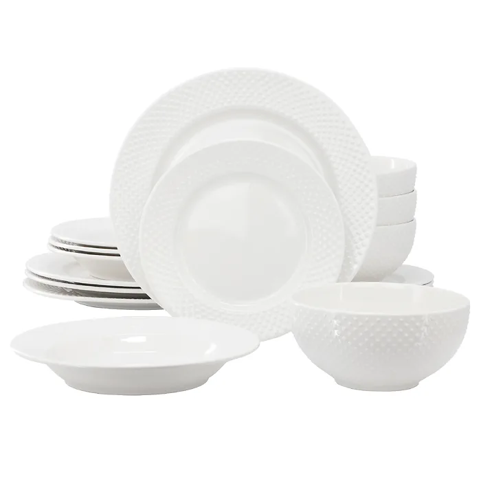 Elevate your dining experience with the Elama Kim Elegant 16-Piece Porcelain Dinnerware Set, crafted to add a hint of sophistication to any meal. Comprised of high-quality, durable porcelain, this dinnerware set showcases a sleek, glossy finish that enhances its modern appeal. The unique round shape, complemented by a delicate embossed dotted pattern, introduces texture and elegance, making it suitable for both everyday dining and special events.