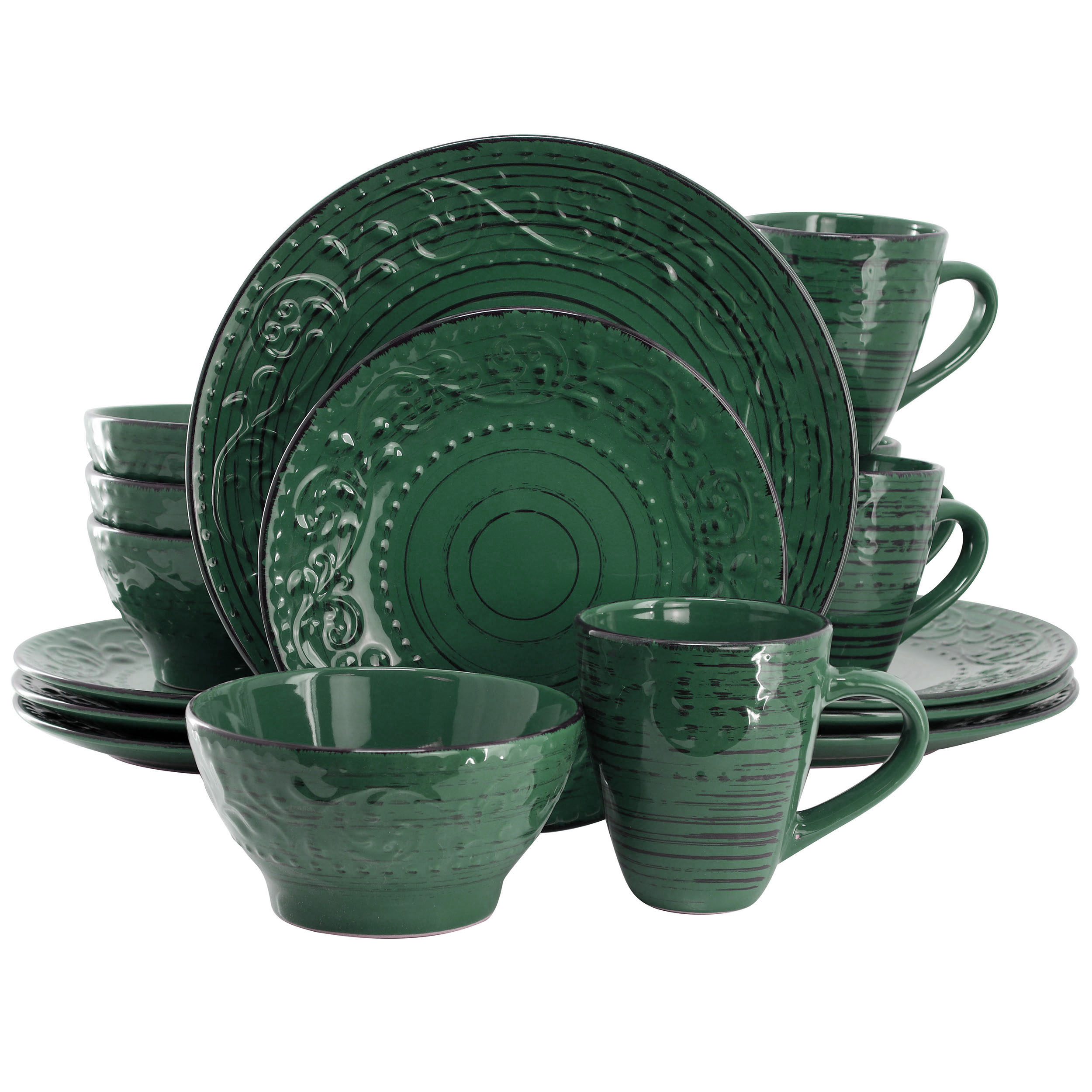 Experience a beachy dinner experience with this elegant Elama Malibu Waves 16-Piece Dinnerware Set in Turquoise. It features a beautiful hand paint work, laid on a sand-embossed stoneware, that will transport you to the coast with every mouthful. This kitchen dinnerware set is subtle enough for intimate dinners, yet its singularity makes it ideal for hosting parties and bigger gatherings. It includes four dinner plates, four dessert plates, four 20 fl oz bowls and four 12 oz mugs, providing service for a family of four. The Elama Malibu Waves 16-Piece Dinnerware Set in Turquoise is dishwasher safe for easy cleaning and maintenance. It's also microwave and oven safe to make it easy to heat and reheat meals. Add some extra dimension and style to your kitchen and dining area with this dinnerware set for four.
