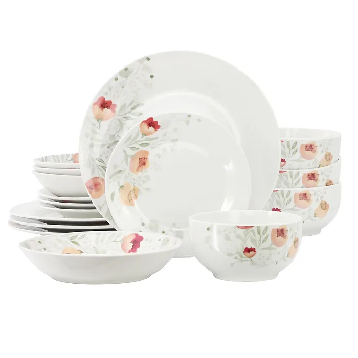 The 16-piece set includes four 10.5-inch dinner plates, four 8-inch salad plates, four 8.8-inch soup bowls (24 oz), and four 5.5-inch cereal bowls (22 oz). Crafted from high-quality porcelain, the Elama Poppy set combines timeless design with durability, making it a versatile addition to your kitchen.