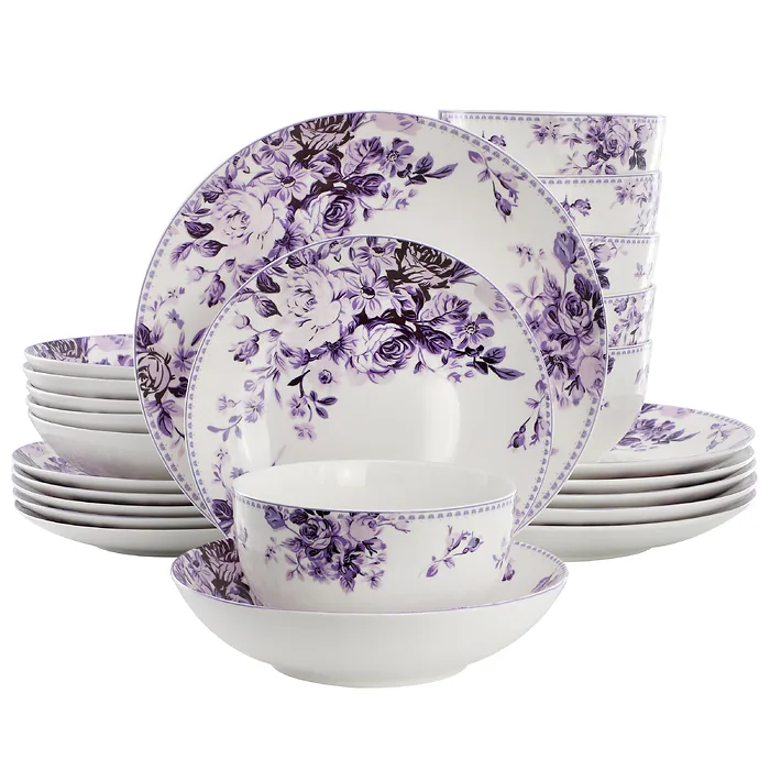 Elevate your dining experience with the Elama 24-Piece Purple Rose Dinner Set. Made from premium porcelain, this dinnerware set is designed for durability and style, perfect for both daily use and special occasions.