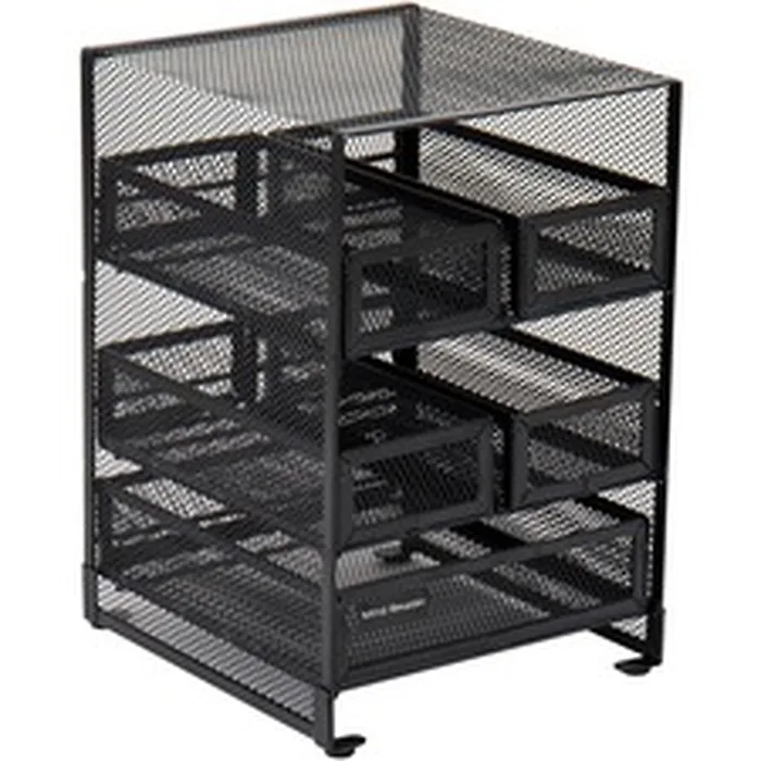Tidy tea and minimize counter clutter in many spaces and rooms beyond the kitchen with this space-saving, Network 5-Compartment Tea Bag Organizer. Expand pantry space in an RV or camper, or use it in a dorm with a small kitchen. It's a welcome addition to your desk, home office setup, breakroom or teachers' lounge since you can store everything you need for a cup of tea in the organizer. Store drink packets, tea/coffee condiments, vitamins, coffee pods and more for convenient access. Organizer sits discreetly on any surface or in a pantry or closet. Each removable drawer holds up to 30 tea bags comfortably. Wide bottom drawer holds sweetener, creamer, honey packets and stirrers. Easy-to-clean drawers only require a damp cloth to stay dust-free and stain-free. Accessible, mesh design provides open access with complete visibility for easy browsing.