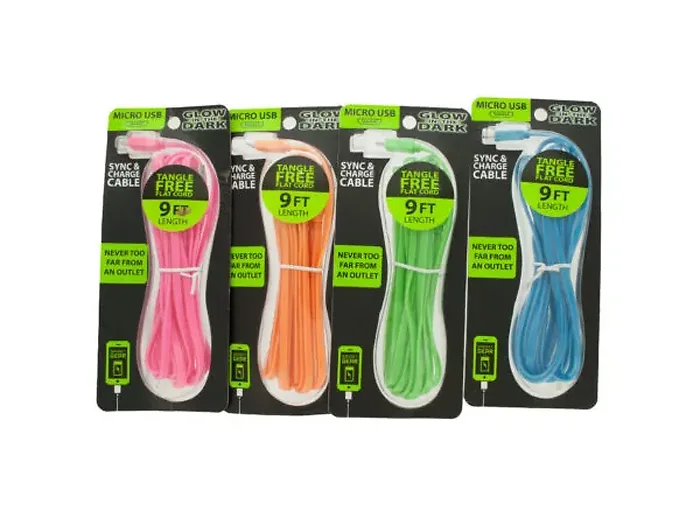 Stay connected day and night with our 9ft Glow in the Dark Micro USB Charging Cable. Designed for convenience, this ultra-flexible and tangle-free flat cord is perfect for charging smartphones, tablets, and other Micro USB compatible devices. Say goodbye to fumbling in the dark; the glow in the dark feature ensures you can easily locate your cable, no matter where you are.