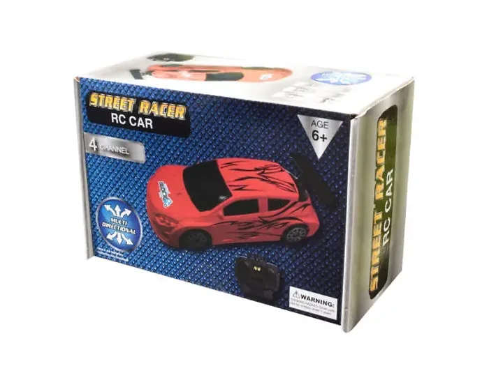The car is equipped with a convenient on/off switch located on the bottom, and a steering wheel gauge to help correct balance while racing. The remote control operates on 2 AA batteries (not included) while the car requires 3 AAA batteries (not included). It comes neatly packaged in a colorful box and is recommended for children aged 3 and above.