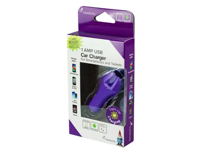 Perfect for on the daily road errands. This Travelocity Purple Light Up USB Car Charger will keep your digital devices charged. Great for Smartphones and tablets, the 1 AMP USB Car Charger features sophisticated circuit design with over-heated, over-current and over-charging protection. It is compatible with most USB devices and charges your device quickly and safely. The charger 2.75" x 1" in size. Comes packaged in a blister pack.