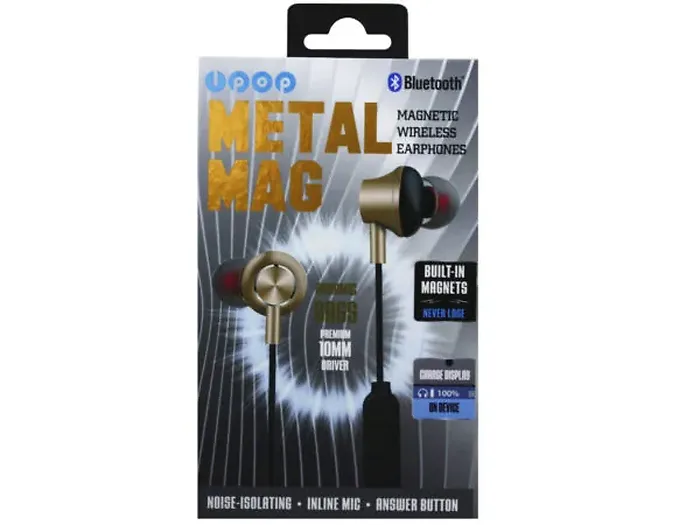 The iPop Metal Mag Bluetooth Earphones in Gold and Black offer an exceptional audio experience with premium stereo sound and dynamic bass. Stay connected with the built-in volume control and in-line microphone with an answer button for seamless call handling.