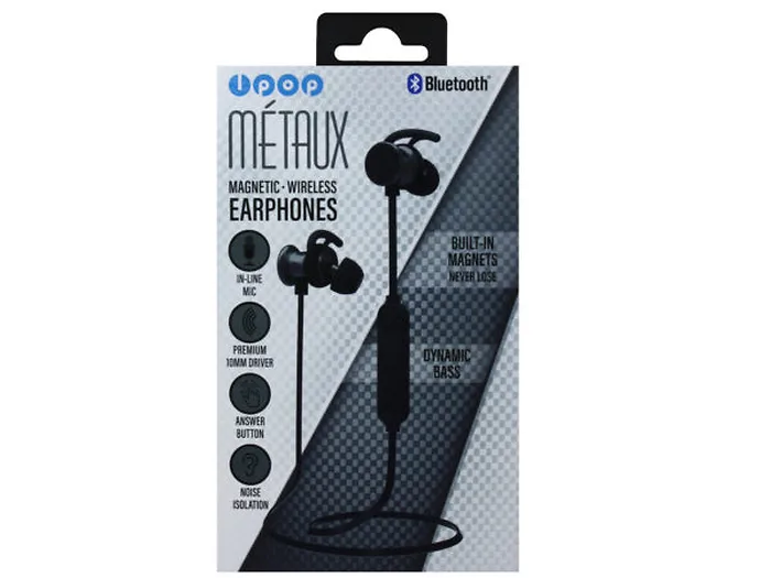 The iPop Metaux Grey Sport Bluetooth Earphones provide premium stereo sound, dynamic bass, with volume control and in-line microphone with convenient answer button so you never miss a call. The magnetic feature attaches earphones together, to avoid losing and for easy storage. Metaux earphones are made of lightweight metal and have a tangle-free cable. Wireless design is perfect for those on the go. Includes wireless magnetic earphones, zip case, USB charging cable, 4 sets of extra ear cushions and operating manual. Comes packaged in a hanging magnetic close box that can be opened to see contents inside.