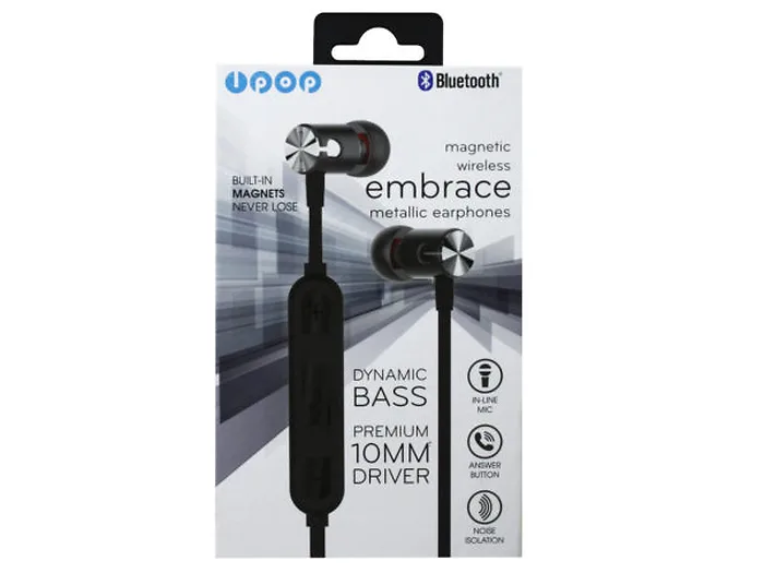 The iPop Embrace Black Bluetooth Earphones provide premium stereo sound, dynamic bass, with volume control and in-line microphone with a convenient answer button so you never miss a call. The magnetic feature attaches earphones together, to avoid losing and for easy storage. Embrace earphones are made of lightweight metal and have a tangle-free cable. Wireless design is perfect for those on the go. Includes wireless magnetic earphones, zip case, USB charging cable, 4 sets of extra ear cushions and operating manual. Comes packaged in a high quality hanging magnetic close box that can be opened to see contents inside.