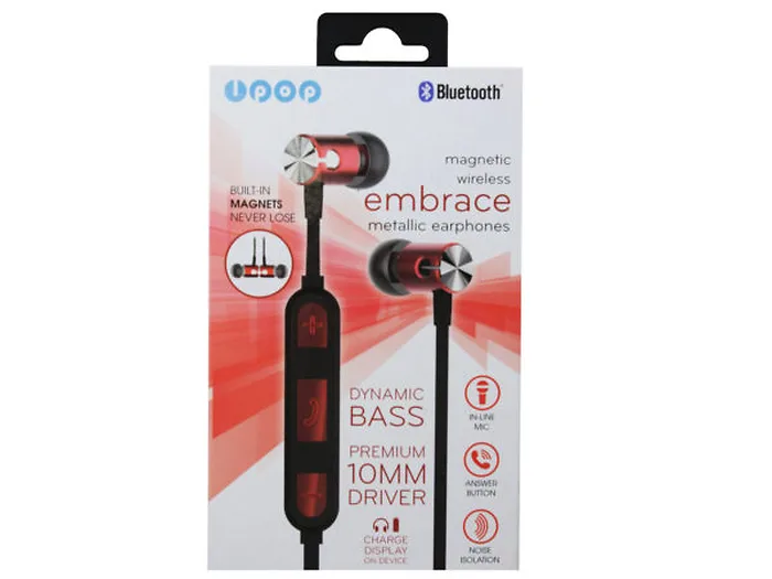 The iPop Embrace Red Bluetooth Earphones provide premium stereo sound, dynamic bass, with volume control and in-line microphone with a convenient answer button so you never miss a call. The magnetic feature attaches earphones together, to avoid losing and for easy storage. Embrace earphones are made of lightweight metal and have a tangle-free cable. Wireless design is perfect for those on the go. Includes wireless magnetic earphones, zip case, USB charging cable, 4 sets of extra ear cushions and operating manual. Comes packaged in a high quality hanging magnetic close box that can be opened to see contents inside.